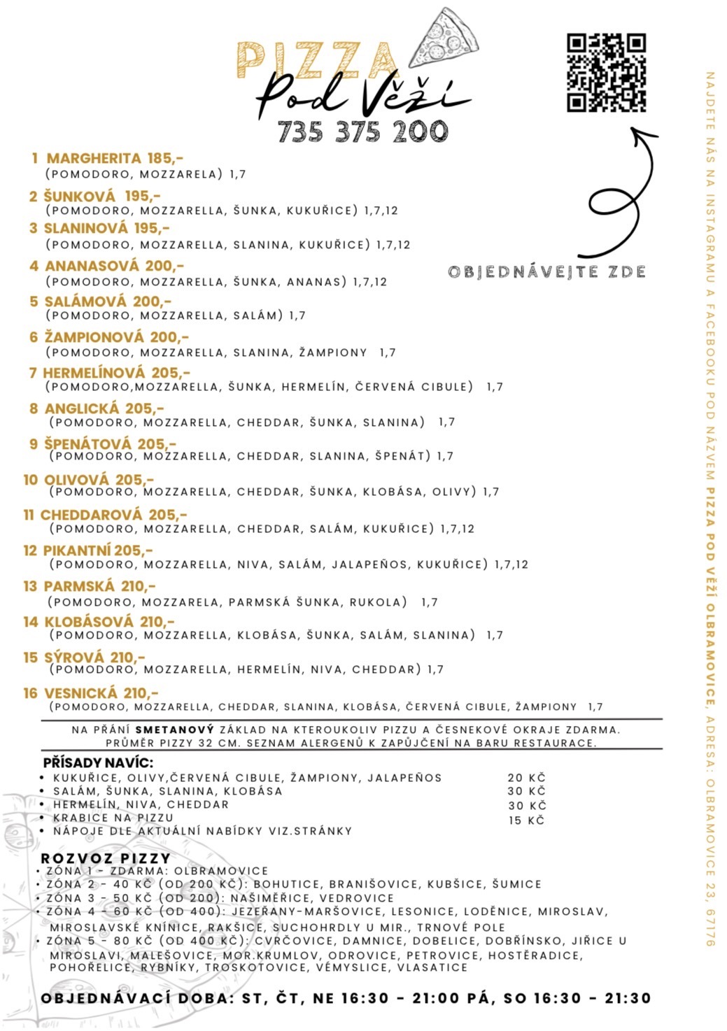 Vřele Vás vítáme v Olbramovicích na jižní Moravě v Pizza Pod Věží ! Stavte se u nás na chutnou pizzu, případně Vám ji dovezeme až domů, osvěžující pivo, limo nebo sklenku vína. K tomu Vám rádi připravíme výbornou kávu nebo čaj. Máte chuť na něco sladkého? Naše kopečková zmrzlina Vás určitě potěší! Případně můžete využít i příjemné posezení venku na čerstvém vzduchu jako ideální setkání s přáteli i rodinou.